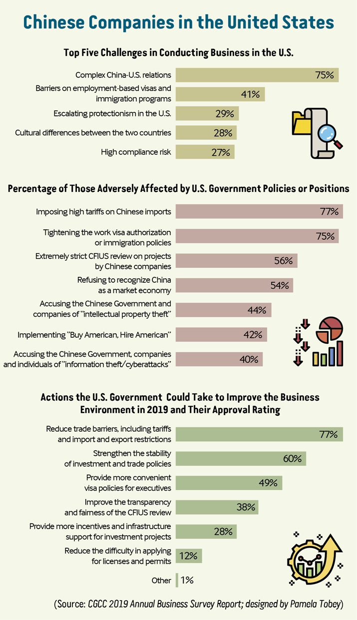 Challenges ahead Chinese FDI in the U.S. is a lagging indicator of broader China-U.S. relations, said the report. Although it is the second largest economy, China accounts for approximately 1 percent of overall FDI in the U.S., about one 10th of Japanese FDI in the country, according to the U.S. Bureau of Economic Analysis (BEA). The growth potential of China's FDI in the U.S. is obviously huge, but the path forward is bound to be bumpy. Faced with the complicated relations between the two countries, Chinese investors are uneasy about the current situation and are not optimistic about their future. The survey results found that 75 percent of respondents cited the complex relationship between the countries as one of their key challenges. Over half, or 52 percent, of respondents felt that the U.S. investment and business environment declined in 2018, more than double from the rate in 2017, which stood at 23 percent. Another 30 percent of respondents expect the investment and business environment to decline over the next two years. The report also showed that tariffs top the list of concerns of policy-related challenges, with 77 percent of respondents stating that they had been adversely impacted by these policies. When surveyed on additional tariffs, 44 percent of respondents impacted by the trade war will delay future investment in the U.S. in the next two years until both countries reach a deal, while 38 percent intend to adjust their global supply chain in the long run in order to avoid tariffs. "We've seen a number of projects be put on hold. People are very cautious and tentative about proceeding with their GIs in the state," said Justin Kocher, senior manager of business development for Asia at JobsOhio, a private non-profit corporation focused on driving job creation and new capital investment in Ohio. "They want to see how the trade war plays out." As the report stated, the future of FDI in the U.S., to some extent, is the future of the country itself. FDI supports more than 7 million jobs in the U.S., with jobs paying compensation 26 percent higher than the U.S. private sector on average, and producing more than $1 billion a day in exports, according to BEA data. The challenges for Chinese investors in the U.S. are more or less U.S. challenges as well. "We should support both of our governments to have the political will and the political courage to come to an agreement, to address the real issues that will benefit both of our economies," said Allen at the conclusion of the panel discussion. (Reporting from Washington, D.C.) Copyedited by Rebeca Toledo Comments to zhaowei@bjreview.com |