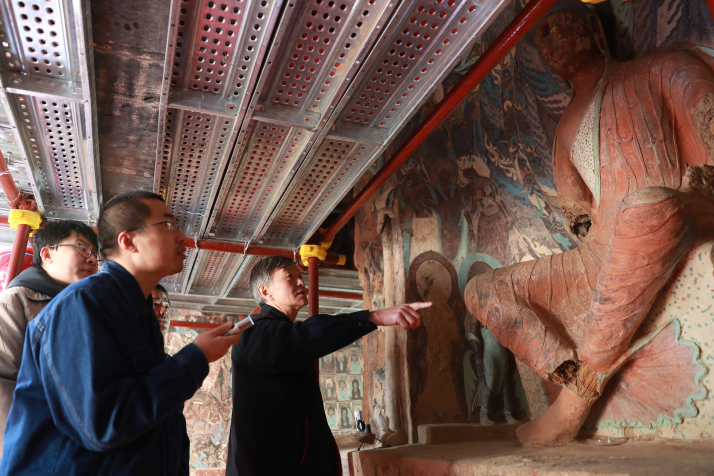 ![]() Su Bomin (right) checks the restoration of murals in a cave in the Mogao Grottoes, Dunhuang, Gansu Province, on February 23 (XINHUA)