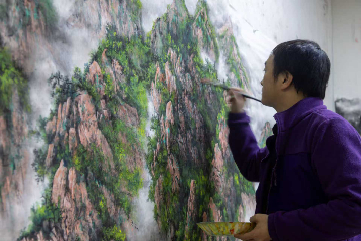 ![]() Shu Yong works on a large-scale landscape painting in February 2026 (COURTESY PHOTO)