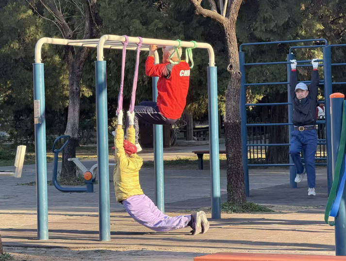 Spending the morning at the Temple of Heaven Park in Beijing will make many young people rethink what it means to be "old." Shortly after the gates open at dawn, a wave of silver-haired regulars streams in, scattering across the park. One corner, however, draws the biggest crowd—a cluster of parallel bars, horizontal bars and other outdoor fitness equipment. These seniors know each other well. They greet one another, trade small talk, ease into their warm-ups and then launch into their signature moves. Some elderly men swing their legs onto the parallel bars and then hold a handstand. Others pump out pull-ups on the horizontal bar. A group gathers on the sit-up benches, performing advanced crunches—hovering in the air as they curl their torsos upward, all while chatting and laughing as if it were nothing. For many people half their age, these moves would pose a serious challenge. These "morning exercise grandpas" have long been a viral sensation on Chinese social media. You'll find them in parks nationwide, their jaw-dropping skills and effortless mastery leaving younger generations in awe. Consider the gray-haired man who spins a full circle on the horizontal bar, without even bending his knees. Park veterans On March 17, Team China table tennis player Qian Tianyi took to social media to share a video from Wudingmen Park in Nanjing, Jiangsu Province. She joked in the caption: "Young people should go to parks less often—it can easily hurt your self-esteem." In the footage, she encountered uncles and aunties doing advanced stretches, making homemade chalk for better grip, and playing table tennis with impressive skill. She even joined a match with a left-handed "uncle" who mimicked table tennis star player Fan Zhendong's signature moves. "Even as a professional athlete, I felt challenged by these grassroots veterans," she wrote. In Chinese culture, "uncle" and "auntie" are terms of respect and familiarity used to address older adults who are not necessarily relatives. This wasn't the first time a star was awed by seniors at a neighborhood court. Back in 2021, former table tennis champion Zhang Jike was outplayed by an 80-year-old man who switched hands fluently; the senior then teamed up with his wife for mixed doubles and used steady tactics to put the former Grand Slam winner under heavy pressure. Popular actor Tu Songyan also shared a video on Douyin (the Chinese version of TikTok) on March 11, capturing a morning visit to the Temple of Heaven Park. "You can feel the vitality," he said. "Every major park is full of hidden masters." He chatted with an 81-year-old man who told him the oldest regular there was 96. For some people there in their 70s, navigating the full length of the monkey bars—a horizontal ladder—is considered standard. Tu decided to give the monkey bars a try. He took one swing and let go, finding it more challenging than it looked. "My hands hurt," he admitted. An old-timer next to him explained it takes two or three years of practice to build up to it, and showed Tu the calluses on his hands—honed from years of gripping the bars. "Morning workouts in Beijing's parks are no joke," Tu said. "There's just no competing with these grandpas and grandmas." Not every senior in the park pursues such "hard stunts." Among those who don't is 68-year-old Zhang Yu, who leads a small troupe specializing in a remarkable four-ring acrobatic catch—a skill he has honed over 22 years of daily practice. In 2004, as he neared retirement, Zhang discovered the activity during a workout at the Temple of Heaven Park. "It was so much fun," he told newspaper Beijing Daily. The game was invented by an elder surnamed Song, who also taught everyone how to handcraft the rings. Each ring has a soft rubber inner layer wrapped in red and yellow fabric, measuring about 30 centimeters in diameter and weighing roughly 150 grams. The setup is simple but demanding: One thrower stands 10 to 15 meters away and simultaneously tosses four rings, while four "targets" stand in a row, catching the rings with their heads or necks. The goal is to land all four rings in one go. Zhang is currently the only one who can consistently execute the four-ring toss successfully—a skill that took him some five years to master. Beginners typically need about a month or so just to get the hang of it. For Zhang and his companions, ring tossing is about far more than physical fitness. "It's a full-body exercise—it works the neck, shoulders and strengthens the core," he explained. "But more importantly, it's helped me find like-minded friends who share my passion for staying active as we age." Health and passion Young netizens have two main theories for why seniors seem so energetic and healthy: They no longer have to work, and they have a stable pension. A 72-year-old Beijing resident surnamed Wu, who regularly practices taijiquan (also known as tai chi) at Ditan Park in Beijing, admits that retirement has given him more time to engage in outdoor activities. "When I was working, I sat in an office all day, like a plant," he told Beijing Review. "Since retiring, I finally have more time to stretch my body. Many younger people today have jobs that require long hours of sitting, which definitely affects their health." Wu, like Zhang, has found a steady group of exercise partners at the park. "Many people have experienced real health gains—fewer aches and pains that come with aging, better blood sugar levels and lower blood pressure. Witnessing these benefits is what keeps so many committed to their daily practice," he said. For 68-year-old Wang Yali, however, the motivation goes beyond health. A deep love for an activity and the need for social connection have kept her going for years. Twenty years ago, she suffered a stroke that left her partially paralyzed. She had to rely on a wheelchair for over a year. After recovering, she was out taking a walk at Beijing's Beihai Park when she noticed a group performing a c
