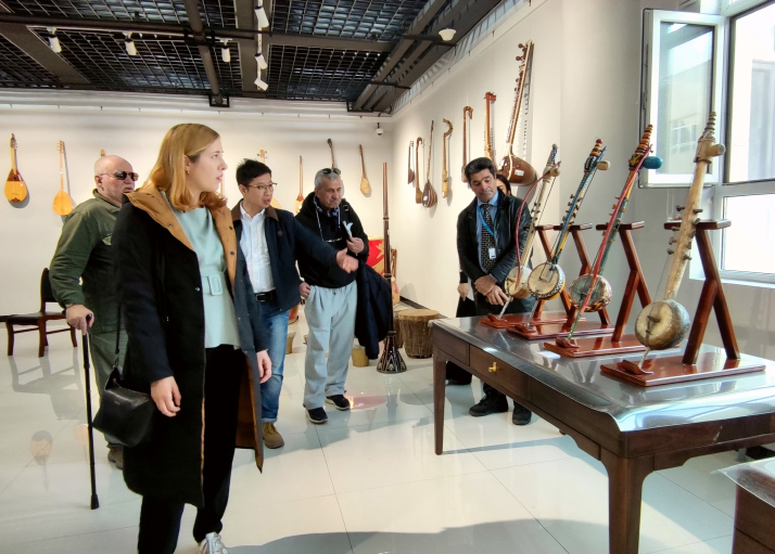 ![]() Visitors from different countries learn about Xinjiang's traditional ethnic music instruments at Xinjiang Arts University in Urumqi on November 4, 2025 (LU YAN)
