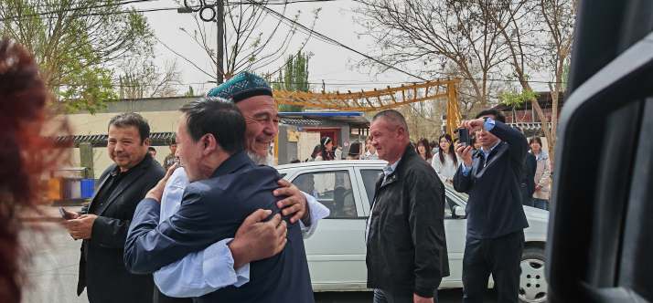 ![]() Before leaving Xinjiang, Zhou Aiwu says goodbye to villagers in Tongqike Village, Yuli County, in May 2023 (COURTESY PHOTO)