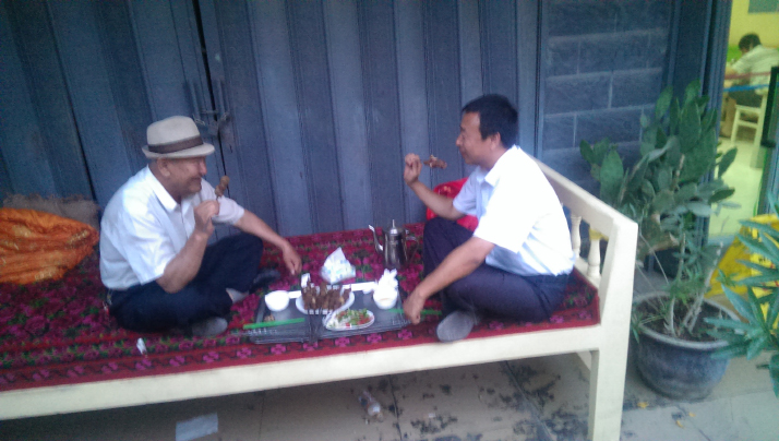 Selected and dispatched to villages by CPC committees at higher levels, first secretaries are part of the village leadership together with members of the CPC village branch and the villagers' committee. They are tasked with helping devise village development plans, resolve transportation, power supply and other practical problems, and enhance villagers' capability of self-governance. Thanks to Zhou, the children in the village flourished academically. Dilixiati got admission in university to study computer information systems administration and upon graduation, secured a well-paying job at the Tarim Oilfield, China's largest ultra-deep oil and gas production base in the hinterland of the Taklimakan. He credits Zhou's support as the reason for his success. Zhou's remarkable ability to connect with the children was due to his fluency in the Uygur language. Upon arriving in Xinjiang, he deliberately sought out the most isolated post available: a village called Qiongmaili, the last location in the entire autonomous region to gain access to electricity. He lived and worked there alongside the villagers for four months, and it was there that he began learning Uygur. Progress was initially slow; it took him eight months just to master the 32 letters of the alphabet. He devoted over six hours daily to studying Uygur: listening to recordings in the morning, watching television in the evening, and memorizing words whenever possible during the day. Over the years, he filled more than 40 notebooks with his Uygur lessons. Colleagues, gatekeepers, sanitation workers and even the naan vendors became his impromptu tutors. Mastering the language greatly improved his work efficiency. Zhou spent two months visiting over 1,000 households without interpreters, armed with a Uygur-standard Chinese dictionary. He documented every difficulty and problem he encountered, compiling a list of more than 200 issues, most of which were eventually resolved. ![]() Zhou Aiwu (right) eats kebabs with a resident in Yuli in August 2015 (COURTESY PHOTO)