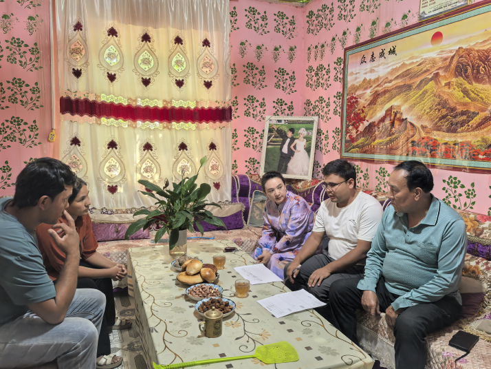 ![]() Gulibaiheremu Maimaiti (third right), a member of the CPPCC Xinjiang Uygur Autonomous Regional Committee, visits a farmer's home in Shache County, Kashi (Kashgar) Prefecture. Gulibaiheremu is a senior agronomist at the Shache County Agricultural Technology Promotion Center (COURTESY PHOTO)