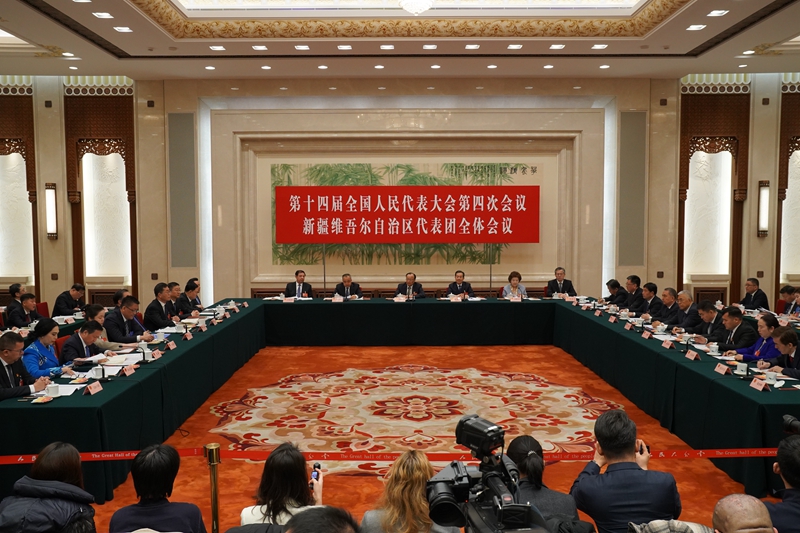 The delegation of Xinjiang Uygur Autonomous Region to the Fourth Session of the 14th National People’s Congress, China’s top legislature, hosts an open day event for international media on March 6 (ZHANG WEI) Sustained stability Today, across Xinjiang’s cities and rural areas alike, streets are brightly lit at night and bustling with activity. Shopping malls and markets bustle with activity, school surroundings are safe and orderly, and neighbors in rural communities live in harmony. Both north and south of the Tianshan Mountains, a new atmosphere of stability, unity and shared endeavor is taking shape, Wang Mingshan, Deputy Director of the Standing Committee of Xinjiang Uygur Autonomous Regional People’s Congress, said. Through sustained efforts, Xinjiang has gone several consecutive years without a single violent terrorist incident. Public order remains stable. A system of local regulations with distinctive regional characteristics has steadily taken shape, bringing counterterrorism, stability maintenance and de-radicalization firmly onto a law-based track, Wang added. He said Xinjiang will prioritize social stability above all else, continue advancing governance under the rule of law, consolidate its hard-won social harmony and ensure long-term peace. High-standard opening up From 2021 to 2025, Xinjiang’s total foreign trade surged from 156.9 billion yuan ($22.7 billion) to 520.37 billion yuan ($75.4 billion). Last year, its export and import volume recorded an increase of 15.9 percent year on year, the fastest in the country. Accounting for this acceleration, Zheng Jun, a counselor to the regional government, pointed to the combined effect of several factors: Xinjiang’s geographic advantage, the growing role of international transport corridors, the strengthening of industrial support and a range of favorable policy measures working in concert. Wang Kuiran, Secretary General of the regional government, said in recent years, certain countries have imposed unjustified sanctions on some enterprises and individuals related to the region. These actions are based on false allegations such as those of forced labor, undermining international law and global trade rules under the disguise of human rights while attempting to hinder China’s development, Wang said. "We firmly oppose and resolutely counter such actions," he said, adding that Xinjiang’s development has never been deterred by external pressure. During the 15th Five-Year Plan period, the goal is to achieve steady foreign trade growth, foster a more diverse range of foreign trade market entities and continue improving the export structure, advancing toward higher-quality development, Zheng said. Green development Erkin said in recent years Xinjiang’s new energy sector has expanded rapidly and maintained strong momentum. Netizens have even given the region a nickname: the “super green power bank.” He said Xinjiang is endowed with exceptional natural conditions for renewable energy, with its wind and sunshine being among the most abundant in China. At present, five major electricity transmission corridors have been built to deliver power from Xinjiang to other parts of the country. Since 2010, the region has transmitted more than 1 trillion kilowatt-hours (kwh) of electricity to 22 provinces, autonomous regions and municipalities. Nearly 1 out of every 3 kwh outbound electricity from Xinjiang is generated from renewable sources. The environmental impact is obvious. The outbound power transmission from Xinjiang has helped reduce carbon emissions by about 240 million tons, equivalent to adding at least 24 million hectares of forest coverage. These efforts have contributed to safeguarding national energy security and advancing China’s broader energy transition, Erkin said. China has pledged that by 2035 the combined installed capacity of wind and solar power will reach around 3.6 billion kilowatts. This national target provides vast new opportunities for Xinjiang’s renewable energy development, Erkin added.