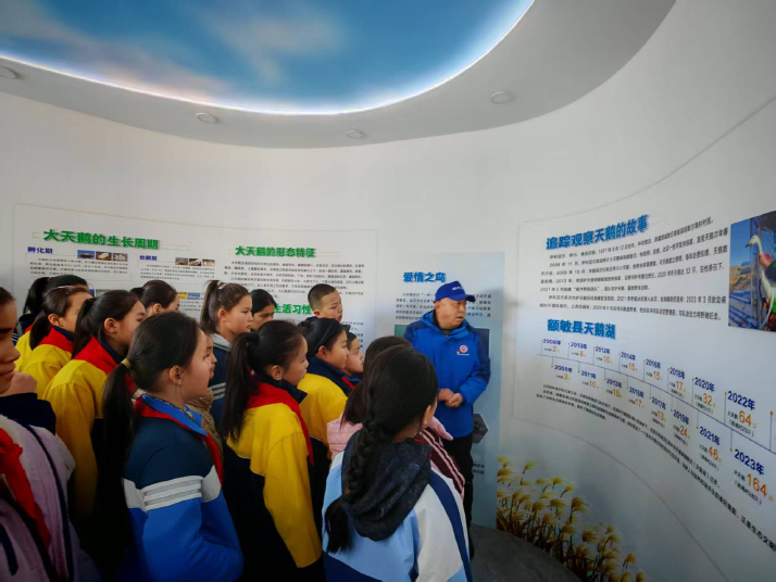 This dedication recently won recognition. Known as the "White Feather Guardians," the initiative, led by Wu Liping, a 61-year-old retiree, received the Gold Award at the 2025 Xinjiang Volunteer Service Project Competition. ![]() A volunteer gives a guided tour for visiting teachers and students at the Swan Science Popularization Center in Emin County on January 4 (COURTESY PHOTO)
