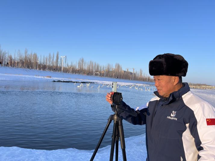 ![]() Wu Liping livestreams the swans on the Emin River in December 2024 (COURTESY PHOTO)