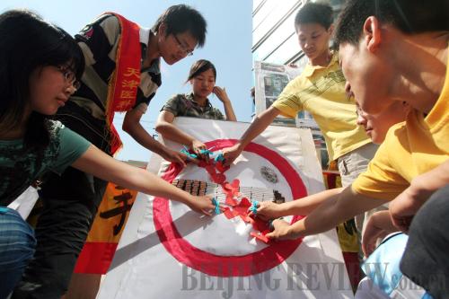 SMOKE FREE FUTURE: Student volunteers from Tianjin Medical University publicize no-smoking education with the theme of refusing second-hand smoking on May 31, 2009 (LIU XIAOCHUAN) |