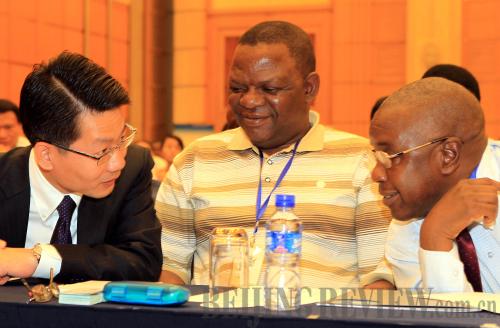 TALKING BUSINESS: Chinese and Zimbabwean entrepreneurs exchange views at a bilateral investment forum in Shanghai on August 12 (ZHANG MING) |